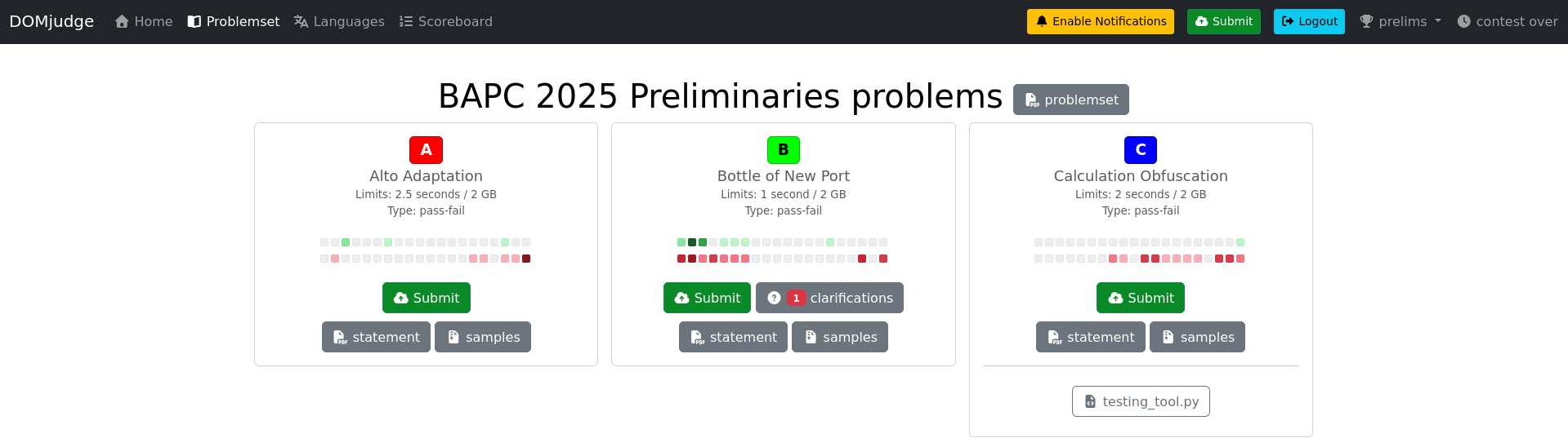 Judges may distribute the digital versions of the problems either individually per or as full problemset through DOMjudge. If the judges issue a clarification for a problem, it will be sent out and displayed in the corresponding problem card. The judges may provide additional files for a problem, such as extra inputs, testing tools, or other relevant attachments. You can use the problemset page to help decide which problem to solve next. DOMjudge shows the live contest progress, including the number of successful and failed submissions for each problem. Use the info from the problemset page and the scoreboard to gauge problem difficulty. A good rule of thumb is: Problems solved often and early in the contest are likely easier. Problems solved infrequently or only later in the contest are typically more difficult.